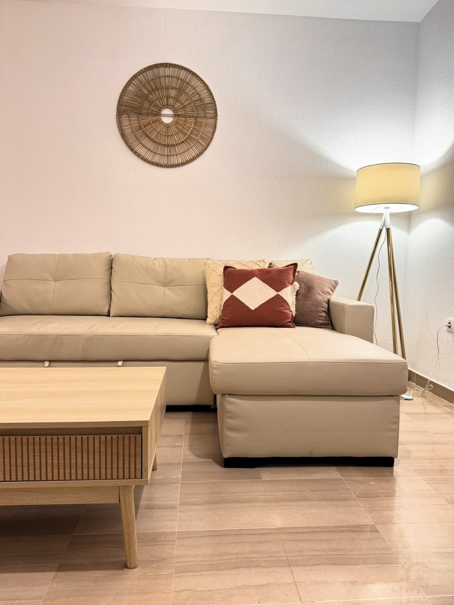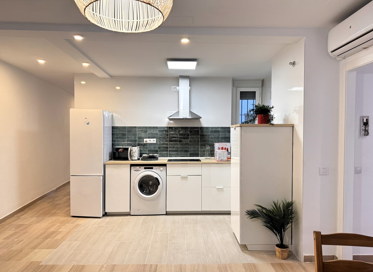 El alojamiento consta de un gran salón comedor con cocina vista, hay un balcón a la calle y tiene una TV de 55" con smart TV para disfrutar después de un largo día. Este salón tiene un sofá cama disponible.